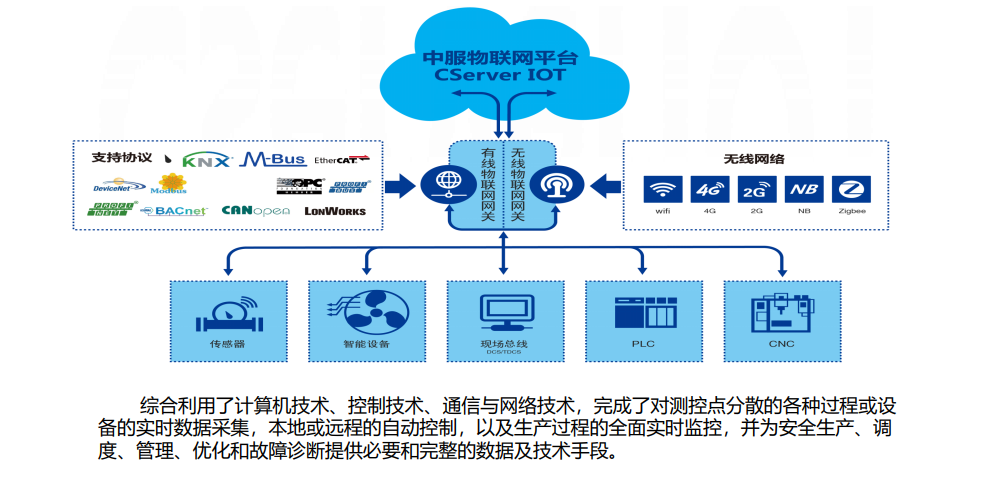 中服物联网平台综合利用了计算机技术、控制技术、通信与网络技术,完成了对测控点分散的各种过程或设备的实时数据采集,本地或远程的自动控制,以及生产过程的全面实时监控,并为安全生产、调度、管理、优化和故障诊断提供必要和完整的数据及技术手段。