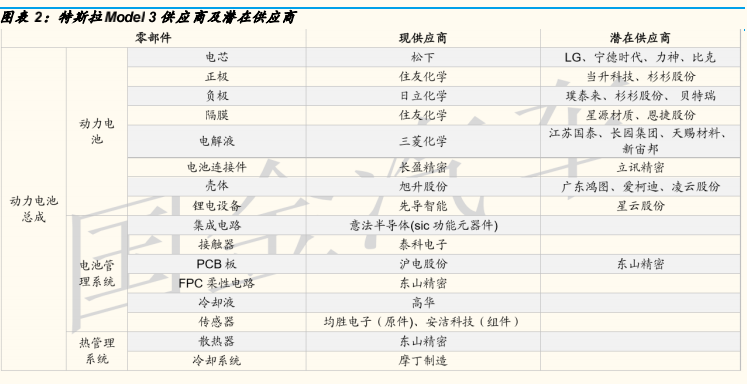 汽零环节有望普遍受益。特斯拉落户的江浙沪地区汽车产业链布局完整、 发展成熟,本地化产业链配套是惯常做法。预计在未来两年已进入特斯拉 的供应商将直接受益于 Model 3 上量利好,同时也存在毛利率降低或特斯 拉更换成本更低的供应商风险。对于潜在供应商,特斯拉供应链的新进入 者能获得纯增量业绩。