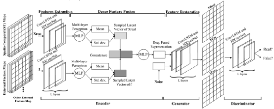 出租车需求、交通流、区域降雨等城市应用的时空(ST)数据具有内在的随机性和不可预测性。最近,提出了基于深度学习的ST预测模型来学习数据的ST特征。然后,这是非常具有挑战性的:(1)充分学习复杂和非线性的时空关系;(2)对时空数据的频繁变化建模,时空数据是动态的,随时间变化(不规律),而且被许多因素影响,如变化的天气,交通事故,交通管制,PoI等;(3)有许多复杂的外部因素能够影响预测的准确性,而且并不能将他们准确的列出来。为了解决以上问题,本文我们提出了一个新颖的基于深度对抗网络的模型(D-GAN),通过通过无监督学习时空特征表示来更准确地进行时空预测。D-GAN模型采用基础的GAN的结构,学习数据的生成和变化推理。D-GAN包含两部分:(1)一个深度时空特征学习网络通过隐形分布建模来对时空关系,语义变化,数据中变化的且不规则的潜在因素建模;(2)一个聚合模块,用于整合外部因素来更好的推断。据我们所知,以前没有任何工作通过深度隐式生成模型和无监督的方式研究时空预测问题。在两个真实数据集上进行的大量实验表明,该方法比传统的基于深度学习的预测方法获得了更准确的结果。