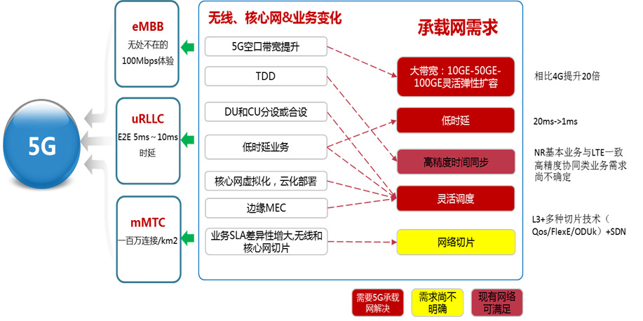 5G最重要的需求之一,就是低时延低,车联网,工业控制等垂直行业对时延和可靠性要求苛刻,需要实现个位数毫秒级的端到端时延和几乎100%(6个9级别99.9999%)的可靠性。这要求承载网技能提供超低的传送时延和超低的处理时延,又能提供极强的故障恢复能力。