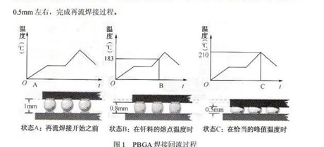 状态A:此时焊球呈固体球状。它们依靠焊膏黏附并固定在焊盘上,BGA封装体离板高度约等于焊球的直径和焊盘厚度之和(例如1mm).状态B:进入预热区后,随着温度的逐渐升高,助焊剂的活性逐渐被激活:特别是进入助焊剂浸润区的末端时,焊料开始熔化,随着其熔化过程的推进,封装体的离板高度也开始有1mm减少到0.8mm左右。
