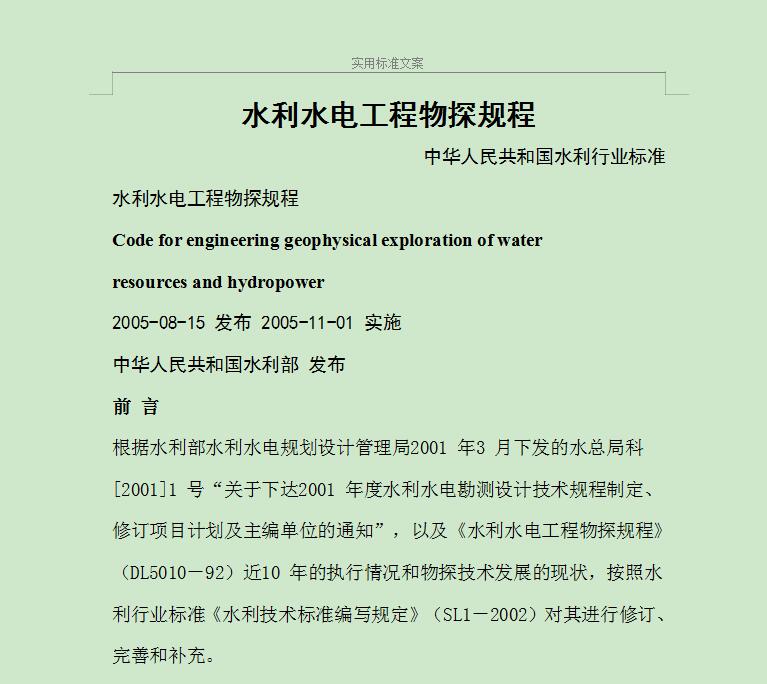 引用标准,术语、符号和代号,在物探方法与技术一章中,有一般规定、高密度电法、瞬变电磁法、可控源音频大地电磁测深法、探地雷达法、瑞雷波法、层析成像、同位素示踪法等。在物探方法的综合应用一章中,有堤坝隐患探测、隧道施工超前预报、建基岩体质量检测、灌浆效果检测、混凝土质量检测、洞室混凝土衬砌质量检测、锚杆锚固质量检测、防渗墙质量检测、堆石(土)体密度和地基承载力检测、钢衬与混凝土接触状况检测、堆石坝面板质量检测等。