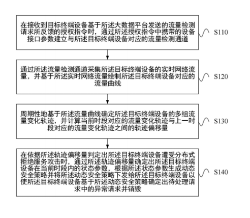 本发明实施例所提供的应用于工业互联网 的网络流量异常检测方法及大数据平台,能够通 过授权指令建立与目标终端设备对应的流量检 测通道,并通过流量检测通道采集目标终端设备 的实时网络流量从而绘制流量曲线,周期性地基 于流量曲线确定目标终端设备的多组流量变化 轨迹,计算不同时段下的流量变化轨迹之间的轨 迹偏移量,在依据轨迹偏移量判定出目标终端设 备遭受分布式拒绝服务攻击时确定出目标终端 设备在当前时段内的状态参数,根据状态参数生 成动态安全策略并下发给目标终端设备。这样可 以使目标终端设备基于动态安全策略确定出待 处理请求中的异常请求并销毁。如此,能够避免 目标终端设备的瘫痪,确保整个工业互联网控制 系统的安全可靠运行。