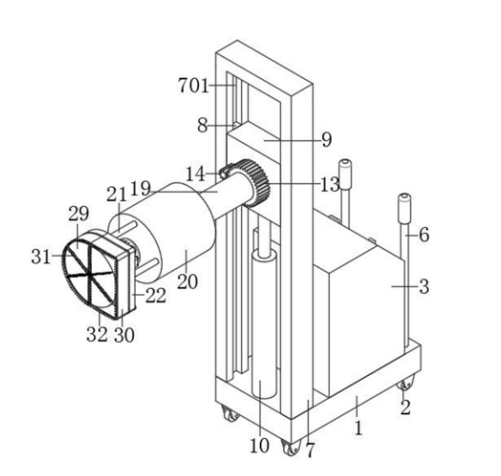 本实用新型涉及工业设备清理设备领域,具 体涉及一种工业互联网显示大屏表面除灰设备, 包括底座、固定杆和电机支架,底座底端四角处 对称设置滚轮,底座顶端中部设置控制箱,控制 箱上端右侧前后分别设置电机开关和液压杆开 关,底座顶端左侧固定安装门型支架,门型支架 前后两侧对称设限位滑槽,限位滑槽内滑动连接 限位滑块,两对称设置的限位滑块内侧端分别固 定连接固定座的前后两侧,固定座底端固定连接 液压杆的伸缩端,液压杆固定端底部固定连接在 底座顶端,固定座左侧中部设圆台型转动槽,本 实用新型通过驱动和调整结构,能够使显示屏的 清灰效果更好,清灰效率也更高,其整体结构简 单合理,操作方便,值得现市场作推广使用。