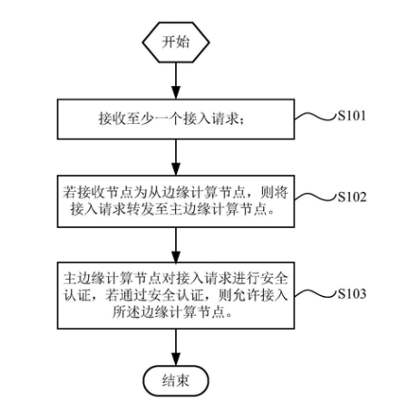本发明公开了一种工业互联网边缘计算节 点的安全认证方法及系统,该方法包括:接收至 少一个接入请求;若接收节点为从边缘计算节 点,则将上述接入请求转发至主边缘计算节点; 上述主边缘计算节点对上述接入请求进行安全 认证,若通过安全认证,则允许接入上述边缘计 算节点。该系统根据不同的计算能力、负载能力 确定特定边缘计算节点,对接入请求的安全验证 权限限制在特定边缘计算节点,并对许可名单内 的接入设备才允许接入网络平台,解决了现有技 术安全认证的可靠性差、网络拥塞等问题。