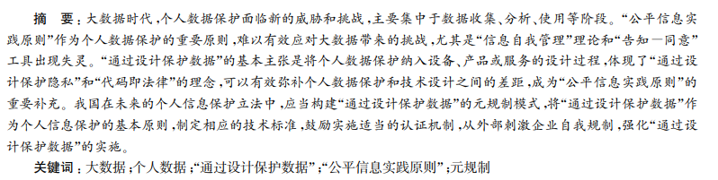 大数据时代 ,个人数据保护面临新的威胁和挑战 ,主要集中于数据收集 、分析 、使用等阶段 。 “公平信息实 践原则”作为个人数据保护的重要原则 ,难以有效应对大数据带来的挑战 ,尤其是“信息自我管理”理论和“告知 - 同意” 工具出现失灵 。 “通过设计保护数据”的基本主张是将个人数据保护纳入设备 、产品或服务的设计过程 ,体现了“通过设 计保护隐私”和“代码即法律”的理念 ,可以有效弥补个人数据保护和技术设计之间的差距 ,成为“公平信息实践原则”的 重要补充 。 我国在未来的个人信息保护立法中 ,应当构建“通过设计保护数据”的元规制模式 ,将“通过设计保护数据”作 为个人信息保护的基本原则 ,制定相应的技术标准 ,鼓励实施适当的认证机制 ,从外部刺激企业自我规制 ,强化“通过设 计保护数据”的实施