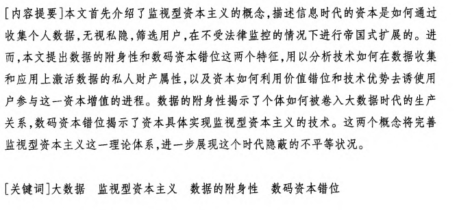 本文首先介绍了监视型资本主义的概念,描述信息时代的资本是如何通过 收集个人数据,无视私隐,筛选用户,在不受法律监控的情况下进行帝国式扩展的。进 而,本文提出数据的附身性和数码资本错位这两个特征,用以分析技术如何在数据收集 和应用上激活数据的私人财产属性,以及资本如何利用价值错位和技术优势去诱使用 户参与这一资本增值的进程。数据的附身性揭示了个体如何被卷入大数据时代的生产 关系,数码资本错位揭示了资本具体实现监视型资本主义的技术。这两个概念将完善 监视型资本主义这一理论体系,进一步展现这个时代隐蔽的不平等状况。