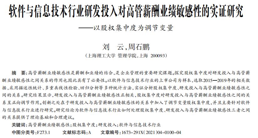 软件与信息技术行业研发投入对高管薪酬业绩敏感性的实证研究_——以股权集中度为调节变量