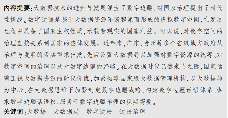 大数据技术的进步与发展催生了数字边疆,对国家治理提出了时代 性挑战。 数字边疆是基于大数据资源不断积累而形成的虚拟数字空间,在发展 过程中具备了国家主权性质,承载着现实的国家利益。 可以说,对数字空间的 治理直接关系到国家的整体发展。 近年来,广东、贵州等多个省级地方政府从 治理与发展的现实需求出发,先后设置大数据局以加强对数字资源的统筹、对 数字空间的治理以及对数字边疆的经略。 在大数据时代已然来临之际,国家亟 需正视大数据资源的时代价值,加紧构建国家级大数据管理机构,以大数据局 为中心,在大数据思维下加紧制定数字边疆战略、构建数字边疆话语体系、谋 求数字边疆话语权,服务于数字边疆治理的现实需要。
