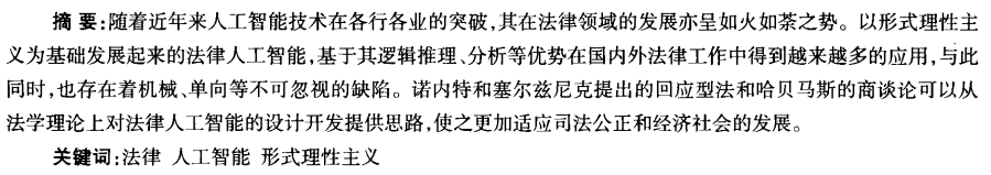 随着近年来人工智能技术在各行各业的突破,其在法律领域的发展亦呈如火如茶之势。以形式理性主 义为基础发展起来的法律人工智能,基于其逻辑推理、分析等优势在国内外法律工作中得到越来越多的应用,与此 同时,也存在着机械、单向等不可忽视的缺陷。诺内特和塞尔兹尼克提出的回应型法和哈贝马斯的商谈论可以从 法学理论上对法律人工智能的设计开发提供思路,使之更加适应司法公正和经济社会的发展。