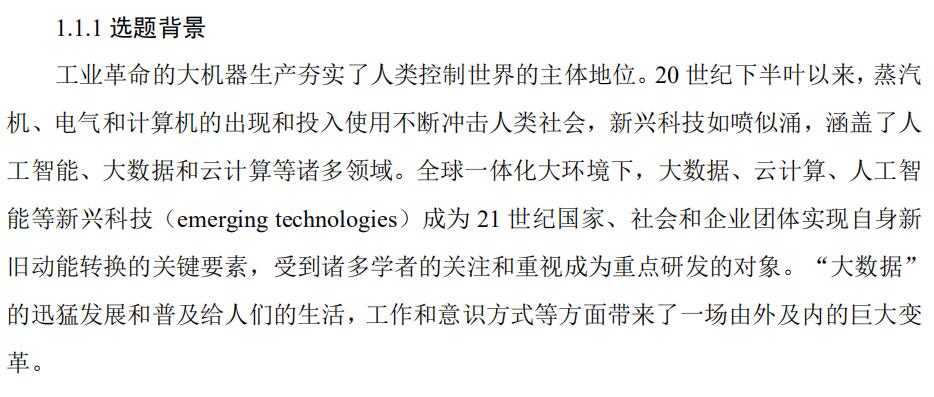 工业革命的大机器生产夯实了人类控制世界的主体地位。20 世纪下半叶以来,蒸汽 机、电气和计算机的出现和投入使用不断冲击人类社会,新兴科技如喷似涌,涵盖了人 工智能、大数据和云计算等诸多领域。全球一体化大环境下,大数据、云计算、人工智 能等新兴科技(emerging technologies)成为 21 世纪国家、社会和企业团体实现自身新 旧动能转换的关键要素,受到诸多学者的关注和重视成为重点研发的对象。“大数据” 的迅猛发展和普及给人们的生活,工作和意识方式等方面带来了一场由外及内的巨大变 革