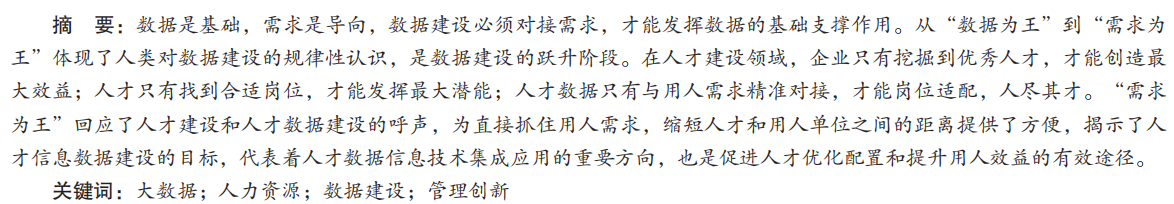 数据是基础, 需求是导向, 数据建设必须对接需求, 才能发挥数据的基础支撑作用。 从“数据为王” 到“需求为 王” 体现了人类对数据建设的规律性认识, 是数据建设的跃升阶段。 在人才建设领域, 企业只有挖掘到优秀人才, 才能创造最 大效益; 人才只有找到合适岗位, 才能发挥最大潜能; 人才数据只有与用人需求精准对接, 才能岗位适配, 人尽其才。 “需求 为王” 回应了人才建设和人才数据建设的呼声, 为直接抓住用人需求, 缩短人才和用人单位之间的距离提供了方便, 揭示了人 才信息数据建设的目标, 代表着人才数据信息技术集成应用的重要方向, 也是促进人才优化配置和提升用人效益的有效途径。