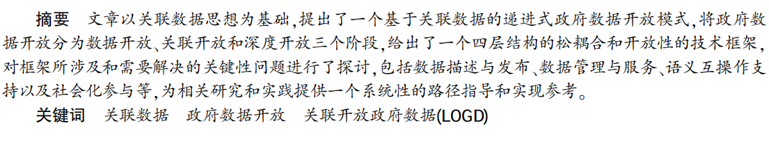 文章以关联数据思想为基础,提出了一个基于关联数据的递进式政府数据开放模式,将政府数 据开放分为数据开放、关联开放和深度开放三个阶段,给出了一个四层结构的松耦合和开放性的技术框架, 对框架所涉及和需要解决的关键性问题进行了探讨,包括数据描述与发布、数据管理与服务、语义互操作支 持以及社会化参与等,为相关研究和实践提供一个系统性的路径指导和实现参考。