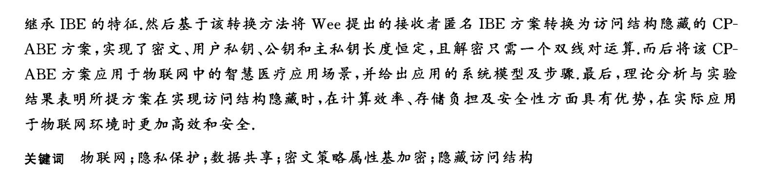 联网的发展一直面临着严峻的安全威胁和挑战,而物联网数据的安全共享及细粒度访问控制 是其急需应对的安全问题之一.针对该问题,提出一种面向物联网数据安全共享的访问结构隐藏的属性 基加密方案.该方案在保证数据隐私的情况下,能够实现密文数据的细粒度访问控制.首先提出一种将 身份加密方案(identity-based encryption,IBE)转换为支持多值属性与门的密文策略属性基加密方案 (ciphertext—policy attribute-based encryption,CP—ABE)的通用转换方法,并且转换后的CP—ABE能够 收稿日期:2018一04一16;修回日期:2018—12—20 基金项目:国家“九七三”重点基础研究发展计划基金项目(2013CB338000);国家重点研发计划项目(2016YFB0501900) This work was supportedbythe National Basic Research Program of China(973 Program)(2013CB338000)and the National Key ResearchandDevelopment Program of China(2016YFB0501900). 万方数据 赵志远等:面向物联网数据安全共享的属性基加密方案 继承IBE的特征.然后基于该转换方法将Wee提出的接收者匿名IBE方案转换为访问结构隐藏的CP— ABE方案,实现了密文、用户私钥、公钥和主私钥长度恒定,且解密只需一个双线对运算.而后将该CP— ABE方案应用于物联网中的智慧医疗应用场景,并给出应用的系统模型及步骤.最后,理论分析与实验 结果表明所提方案在实现访问结构隐藏时,在计算效率、存储负担及安全性方面具有优势,在实际应用 于物联网环境时更加高效和安全.