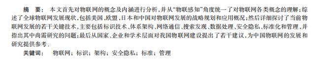 本文首先对物联网的概念及内涵进行分析,并从“物联感知”角度统一了对物联网各类概念的理解;综 述了全球物联网发展现状,包括美国,欧盟,日本和中国对物联网发展的战略规划和应用概况;然后详细探讨了当前物 联网发展的若干关键技术,主要包括标识技术、体系架构、网络通信、搜索发现、数据处理、安全隐私、标准化和管理,并 指出其中尚需研究的问题;最后从国家、企业和学术层面对我国物联网建设提出了若干建议,为中国物联网的发展和 研究提供参考.