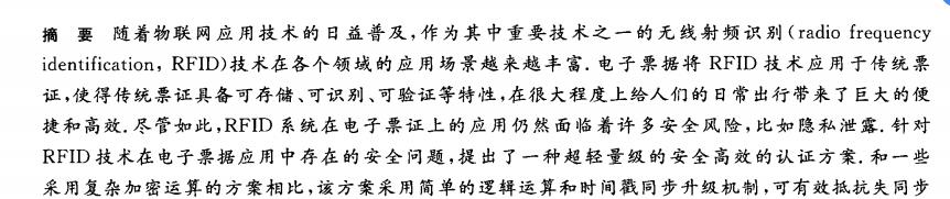 RFID技术在电子票据应用中存在的安全问题,提出了一种超轻量级的安全高效的认证方案.和一些