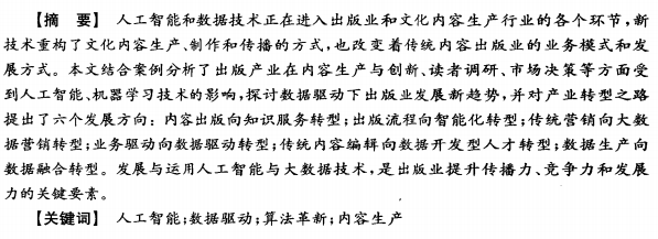 人工智能和数据技术正在进入出版业和文化内容生产行业的各个环节,新 技术重构了文化内容生产、制作和传播的方式,也改变着传统内容出版业的业务模式和发 展方式。本文结合案例分析了出版产业在内容生产与创新、读者调研、市场决策等方面受 到人工智能、机器学习技术的影响,探讨数据驱动下出版业发展新趋势,并对产业转型之路 提出了六个发展方向:内容出版向知识服务转型;出版流程向智能化转型;传统营销向大数 据营销转型;业务驱动向数据驱动转型;传统内容编辑向数据开发型人才转型;数据生产向 数据融合转型。发展与运用人工智能与大数据技术,是出版业提升传播力、竞争力和发展 力的关键要素。