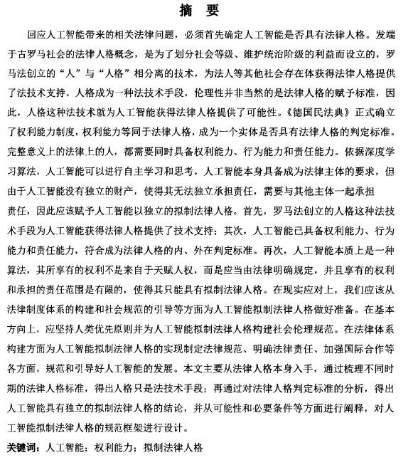 回应人工智能带来的相关法律问题,必须首先确定人工智能是否具有法律人格。发端 于古罗马社会的法律人格概念,是为了划分社会等级、维护统治阶级的利益而设立的,罗 马法创立的“人”与“人格”相分离的技术,为法人等其他社会存在体获得法律人格提供 了法技术支持。人格成为一种法技术手段,伦理性并非当然的是法律人格的赋予标准,因 此,人格这种法技术就为人工智能获得法律人格提供了可能性。《德国民法典》正式确立 了权利能力制度,权利能力等同于法律人格,成为一个实体是否具有法律人格的判定标准。 完整意义上的法律上的人,都需要同时具备权利能力、行为能力和责任能力。依据深度学 习算法,人工智能可以进行自主学习和思考,人工智能本身具备成为法律主体的要求,但 由于人工智能没有独立的财产,使得其无法独立承担责任,需要与其他主体一起承担 责任,因此应该赋予人工智能以独立的拟制法律人格。首先,罗马法创立的人格这种法技 术手段为人工智能获得法律人格提供了技术支持;其次,人工智能己具备权利能力、行为 能力和责任能力,符合成为法律人格的内、外在判定标准。再次,人工智能本质上是一种 算法,其所享有的权利不是来自于天赋人权,而是应当由法律明确规定,并且享有的权利 和承担的责任范围是有限的,使得其只能具有拟制法律人格。在现实应对上,我们应该从 法律制度体系的构建和社会规范的引导等方面为人工智能拟制法律人格做好准备。在基本 方向上,应坚持人类优先原则并为人工智能拟制法律人格构建社会伦理规范。在法律体系 构建方面为人工智能拟制法律人格的实现制定法律规范、明确法律责任、加强国际合作等 各方面,规范和引导好人工智能的发展。本文主要从法律人格本身入手,通过梳理不同时 期的法律人格标准,得出人格只是法技术手段;再通过对法律人格判定标准的分析,得出 人工智能具有独立的拟制法律人格的结论,并从可能性和必要条件等方面进行阐释,对人 工智能拟制法律人格的规范框架进行设计。