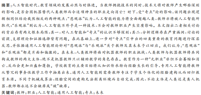 人工智能时代,教育领域的发展必然与时俱进。当教师拥抱技术的同时,技术又将对教师产生哪些深刻 的影响,是否会因机器替代人类教师而令这项神圣的职业走向消亡? 时下,受“奇点”论的影响,该问题出现逻 辑相同但结论截然相反的两种观点:“悲观派”认为,人工智能的能力将全面超越人类,教师亦将被人工智能所 取代;“乐观派”则认为,人工智能不外乎是一种技术,不会对教师职业产生实质影响。本文指出二者相关讨论 的背后存有两大根本局限:其一,对人工智能和“奇点”的认识不够深刻;其二,分析逻辑存在严重漏洞,讨论的 前提、支撑理论和证据选择皆有问题。在此基础上,进一步对“奇点”引申出的四类重要的教育问题进行深层 反思,并依据通用人工智能理论针对“悲观派”与“乐观派”关于教师及其未来予以回应。我们认为:“悲观派” 和“乐观派”都是片面和偏激的。在未来,人类教师将面对机器教师的职业挑战,人类教师与机器教师将共同 构成教师的两大主体,绝不是机器教师只以辅助教学的角色存在。教育作为一种“元职业”非但不会萎缩和消 亡,反而会更加兴盛和蓬勃。学校教育的主要目标将从知识传承转向经验生长的引导,专用人工智能将教师 从繁冗的事务性教学工作中抽离出来,通用人工智能则需要教师专注于学生个体化的经验建构从而回归教 育本源。不同于机械或算法,经验空间的建构无法剥离环境而自动完成,因此,不论主体是人类还是类人机 器,教师都永远不会缺席或“被”缺席。