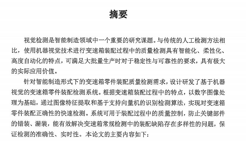 视觉检测是智能制造领域中一个重要的研究课题。与传统的人工检测方法相比,使用机器视觉技术进行变速箱装配过程中的质量检测具有智能化、柔性化、高度自动化的特点,可满足大批量生产时对于稳定性与可靠性的要求,具有极大的实际应用价值。