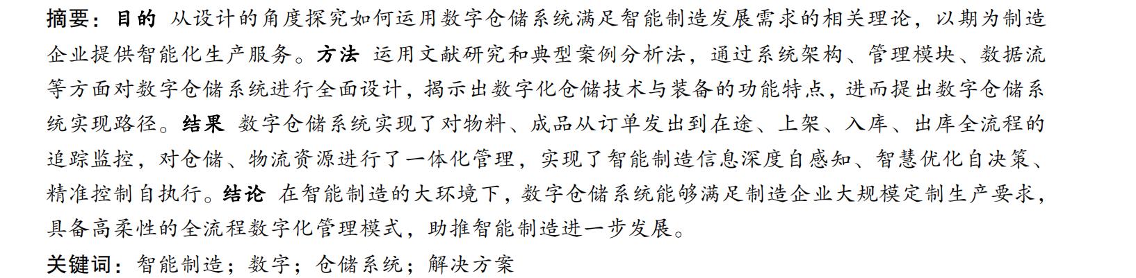目的 从设计的角度探究如何运用数字仓储系统满足智能制造发展需求的相关理论,以期为制造 企业提供智能化生产服务。方法 运用文献研究和典型案例分析法,通过系统架构、管理模块、数据流 等方面对数字仓储系统进行全面设计,揭示出数字化仓储技术与装备的功能特点,进而提出数字仓储系 统实现路径。结果 数字仓储系统实现了对物料、成品从订单发出到在途、上架、入库、出库全流程的 追踪监控,对仓储、物流资源进行了一体化管理,实现了智能制造信息深度自感知、智慧优化自决策、 精准控制自执行。结论 在智能制造的大环境下,数字仓储系统能够满足制造企业大规模定制生产要求, 具备高柔性的全流程数字化管理模式,助推智能制造进一步发展。
