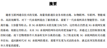 随着互联网通信技术的发展,海量数据通信业务相继出现,如物联网、车联网、智能城 市、高清视频等,对下一代承载网提出了新的要求,需要下一代承载网具有智能管控、长距 离传输、大容量等特点。在 5G 承载网未来的发展方向当中,这些特点仍然是 5G 承载网发展 的基础,根据这些特点,未来 5G 承载网的网络结构将更加扁平化,并通过上层控制器实现 控制功能,而下层物理器件只具备转发和分离的功能,为了快速实现 5G 承载网的相关功能 和目标,适应新时代对 5G 承载网的要求,需要开发更为灵活的业务,满足高突发性的需求 和大带宽的需要。