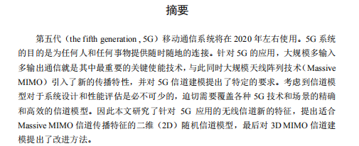 第五代(the fifth generation , 5G)移动通信系统将在 2020 年左右使用。5G 系统 的目的是为任何人和任何事物提供随时随地的连接。针对 5G 的应用,大规模多输入 多输出通信就是其中最重要的关键使能技术,与此同时大规模天线阵列技术(Massive MIMO)引入了新的传播特性,并对 5G 信道建模提出了特定的要求。考虑到信道模 型对于系统设计和性能评估是必不可少的,迫切需要覆盖各种 5G 技术和场景的精确 和高效的信道模型。因此本文研究了针对 5G 应用的无线信道新的特征,提出适合 Massive MIMO 信道传播特征的二维(2D)随机信道模型,最后对 3D MIMO 信道建 模提出了改进方法。