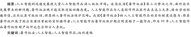 人工智能的迅速发展使大量人工智能作品涌入版权市场。适值我国《著作权法》第三次修改之际,面对技术 发展带来的新问题,著作权法绝不能采取消极回避态度。人工智能作品与人类创作作品在外在表达上无异,经由劳动创 造价值,应承认其可版权性,将其纳入著作权法保护范畴。我国《著作权法》纳入人工智能作品的具体制度设想为:将其 著作权归属于做出实质性贡献的实际操作者;人工智能作品著作权保护期应明显短于一般作品,即为10 年;人工智能作 品著作权除财产权外也包含部分人身权。