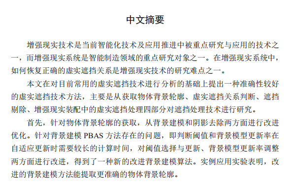 增强现实技术是当前智能化技术及应用推进中被重点研究与应用的技术之 一,而增强现实系统是智能制造领域的重点研究对象之一。在增强现实系统中, 如何恢复正确的虚实遮挡关系是增强现实技术的研究难点之一。