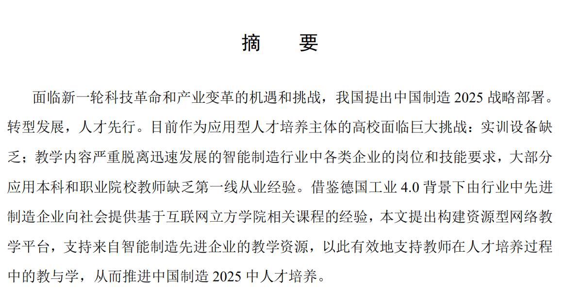 面临新一轮科技革命和产业变革的机遇和挑战,我国提出中国制造 2025 战略部署。 转型发展,人才先行。目前作为应用型人才培养主体的高校面临巨大挑战:实训设备缺 乏;教学内容严重脱离迅速发展的智能制造行业中各类企业的岗位和技能要求,大部分 应用本科和职业院校教师缺乏第一线从业经验。借鉴德国工业 4.0 背景下由行业中先进 制造企业向社会提供基于互联网立方学院相关课程的经验,本文提出构建资源型网络教 学平台,支持来自智能制造先进企业的教学资源,以此有效地支持教师在人才培养过程 中的教与学,从而推进中国制造 2025 中人才培养。