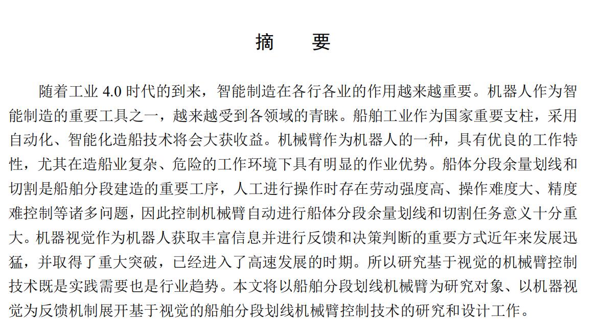 随着工业 4.0 时代的到来,智能制造在各行各业的作用越来越重要。机器人作为智能制造的重要工具之一,越来越受到各领域的青睐。船舶工业作为国家重要支柱,采用自动化、智能化造船技术将会大获收益。机械臂作为机器人的一种,具有优良的工作特性,尤其在造船业复杂、危险的工作环境下具有明显的作业优势。船体分段余量划线和切割是船舶分段建造的重要工序,人工进行操作时存在劳动强度高、操作难度大、精度难控制等诸多问题,因此控制机械臂自动进行船体分段余量划线和切割任务意义十分重大。机器视觉作为机器人获取丰富信息并进行反馈和决策判断的重要方式近年来发展迅猛,并取得了重大突破,已经进入了高速发展的时期。所以研究基于视觉的机械臂控制技术既是实践需要也是行业趋势。本文将以船舶分段划线机械臂为研究对象、以机器视觉为反馈机制展开基于视觉的船舶分段划线机械臂控制技术的研究和设计工作。