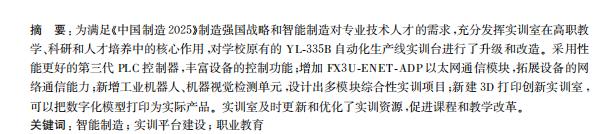 为满足《中国制造 2025》制造强国战略和智能制造对专业技术人才的需求 ,充分发挥实训室在高职教 学 、科研和人才培养中的核心作用 ,对学校原有的 YL-335B 自动化生产线实训台进行了升级和改造 。 采用性 能更好的第三代 PLC 控制器 ,丰富设备的控制功能 ;增加 FX3U-ENET-ADP 以太网通信模块 ,拓展设备的网 络通信能力 ;新增工业机器人 、机器视觉检测单元 ,设计出多模块综合性实训项目 ;新建 3D 打印创新实训室 , 可以把数字化模型打印为实际产品 。 实训室及时更新和优化了实训资源 ,促进课程和教学改革 。