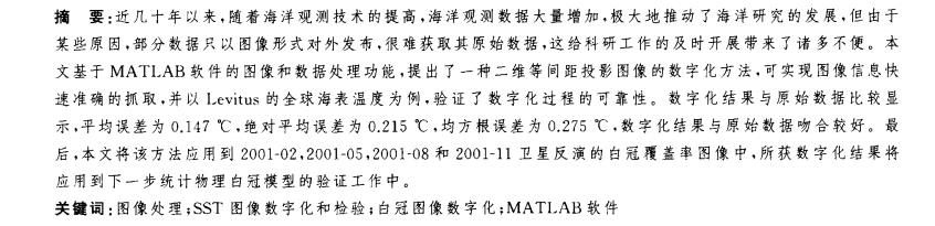 速准确的抓取,并以Levitus的全球海表温度为例,验证了数字化过程的可靠性。数字化结果与原始数据比较显