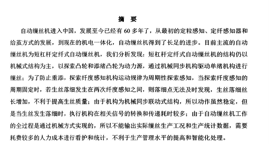 自动缫丝机进入中国,发展至今已经有60多年了,从最初的定粒感知、定纤感知器和给茧方式的发展,到现在的机电一体化,自动缫丝机得到了长足的进步。目前主流的自动缫丝机为短杠杆定纤式自动缫丝机,我们分析发现:短杠杆定纤式自动缫丝机的结构仍以机械式结构为主,以探索凸轮和添绪凸轮为动力源,通过机械同步机构驱动单绪机构进行缫丝;为了防止重添,探索纤度感知机构运动规律为周期性探索感知,当探索纤度感知的周期固定时,若生丝落细发生在两次纤度感知之间,则落细点无法及时发现,生丝落细丝长增加,不利于提高生丝质量;由于机构为机械同步联动式结构,所以动作虽然稳定,但是当生丝发生落细时,执行机构在相关信号的转换和传递耗时较多;由于自动缫丝机工作的全过程是通过机械方式实现的,所以不能输出实际缫丝生产工况和生产统计数据,需要耗费较多的人力成本进行看护和统计,不利于生产管理水平的提高和智能化处理。