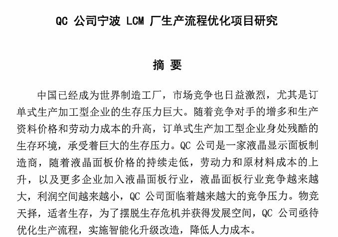 中国已经成为世界制造工厂,市场竞争也日益激烈,尤其是订单式生产加工型企业的生存压力巨大。随着竞争对手的增多和生产资料价格和劳动力成本的升高,订单式生产加工型企业身处残酷的生存环境,承受着巨大的生存压力。QC公司是一家液晶显示面板制造商,随着液晶面板价格的持续走低,劳动力和原材料成本的上升,以及更多企业加入液晶面板行业,液晶面板行业竞争越来越大,利润空间越来越小,QC公司面临着越来越大的竞争压力。物竞天择,适者生存,为了摆脱生存危机并获得发展空间,QC公司亟待优化生产流程,实施智能化升级改造,降低人力成本。