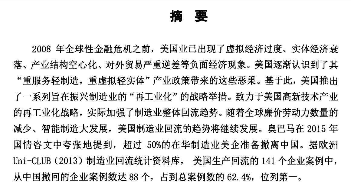 2008年全球性金融危机之前,美国业已出现了虚拟经济过度、实体经济衰落、产业结构空心化、对外贸易严重逆差等负面经济现象。美国逐渐认识到了其“重服务轻制造,重虚拟轻实体”产业政策带来的这些恶果。基于此,美国推出了一系列旨在振兴制造业的“再工业化”的战略举措。致力于美国高新技术产业的再工业化战略,实际加强了制造业整体回流趋势。随着全球廉价劳动力数量的减少、智能制造大发展,美国制造业回流的趋势将继续发展。奥巴马在2015年国情咨文中夸张地提到,超过50%的在华制造业美企准备撤离中国。据欧洲Uni—CLUB(2013)制造业回流统计资料库,美国生产回流的141个企业案例中,从中国撤回的企业案例数达88个,占到总案例数的62.4%,位列第一。