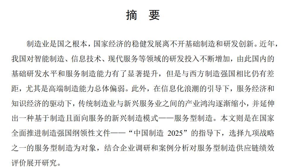 制造业是国之根本,国家经济的稳健发展离不开基础制造和研发创新。近年,我国对智能制造、信息技术、现代服务等领域的研发投入不断增加,由此国内的基础研发水平和服务制造能力有了显著提升,但是与西方制造强国相比仍有差距,尤其是高端制造能力总体偏弱。此外,在信息化浪潮的引导下,服务经济和知识经济的驱动下,传统制造业与新兴服务业之间的产业鸿沟逐渐缩小,并延伸出一种基于制造且面向服务的新兴制造模式——服务型制造。本文则是在国家全面推进制造强国纲领性文件——“中国制造 2025”的指导下,选择九项战略之一的服务型制造为对象,结合企业调研和案例分析对服务型制造供应链绩效评价展开研究。