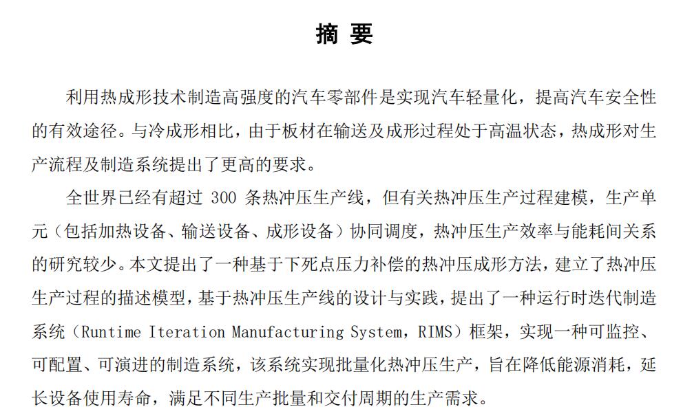 利用热成形技术制造高强度的汽车零部件是实现汽车轻量化,提高汽车安全性的有效途径。与冷成形相比,由于板材在输送及成形过程处于高温状态,热成形对生产流程及制造系统提出了更高的要求。