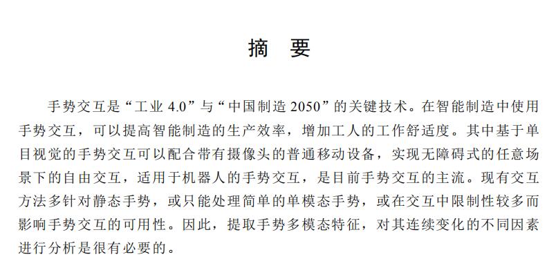 手势交互是“工业 4.0”与“中国制造 2050”的关键技术。在智能制造中使用手势交互,可以提高智能制造的生产效率,增加工人的工作舒适度。其中基于单目视觉的手势交互可以配合带有摄像头的普通移动设备,实现无障碍式的任意场景下的自由交互,适用于机器人的手势交互,是目前手势交互的主流。现有交互方法多针对静态手势,或只能处理简单的单模态手势,或在交互中限制性较多而影响手势交互的可用性。因此,提取手势多模态特征,对其连续变化的不同因素进行分析是很有必要的。