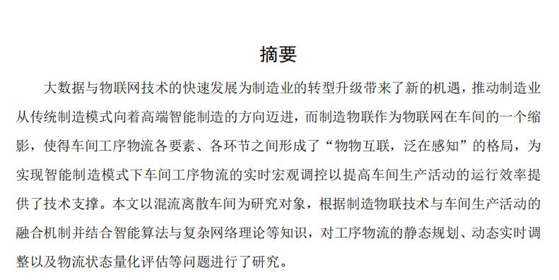 大数据与物联网技术的快速发展为制造业的转型升级带来了新的机遇,推动制造业 从传统制造模式向着高端智能制造的方向迈进,而制造物联作为物联网在车间的一个缩 影,使得车间工序物流各要素、各环节之间形成了“物物互联,泛在感知”的格局,为 实现智能制造模式下车间工序物流的实时宏观调控以提高车间生产活动的运行效率提 供了技术支撑。本文以混流离散车间为研究对象,根据制造物联技术与车间生产活动的 融合机制并结合智能算法与复杂网络理论等知识,对工序物流的静态规划、动态实时调 整以及物流状态量化评估等问题进行了研究。