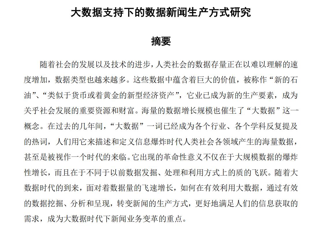 随着社会的发展以及技术的进步,人类社会的数据存量正在以难以理解的速度增加,数据类型也越来越多。这些数据中蕴含着巨大的价值,被称作“新的石油”、“类似于货币或着黄金的新型经济资产”,它业已成为新的生产要素,成为关乎社会发展的重要资源和财富。海量的数据增长规模也催生了“大数据”这一概念。在过去的几年间,“大数据”一词已经成为各个行业、各个学科反复提及的热词,人们用它来描述和定义信息爆炸时代人类社会各领域产生的海量数据,甚至是被视作一个时代的来临。它出现的革命性意义不仅在于大规模数据的爆炸性增长,而且在于不同于以前数据发掘、处理和利用方式上的质的飞跃。随着大数据时代的到来,面对着数据量的飞速增长,如何在有效利用大数据,通过有效的数据挖掘、分析和呈现,转变新闻的生产方式,更好地满足人们的信息获取的需求,成为大数据时代下新闻业务变革的重点。