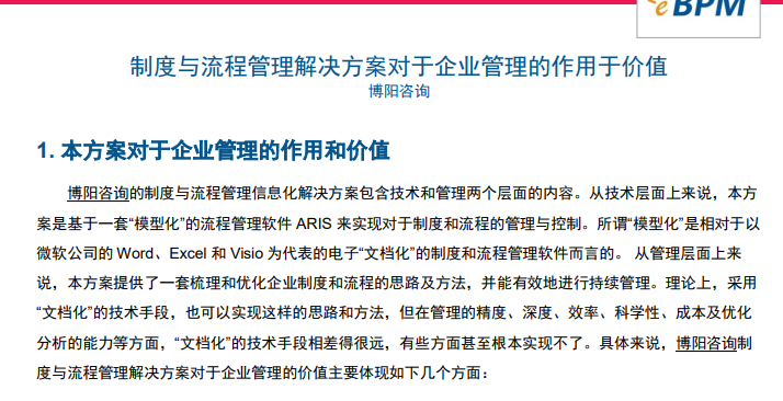 从技术层面上来说,本方 案是基于一套“模型化”的流程管理软件 ARIS 来实现对于制度和流程的管理与控制。所谓“模型化”是相对于以 微软公司的 Word、Excel 和 Visio 为代表的电子“文档化”的制度和流程管理软件而言的。