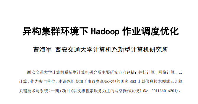 西安交通大学计算机系新型计算机研究所主要研究方向包括:并行计算、网格计算、云 计算。作为参与单位,本课题组参加了由百度牵头承担的国家 863 计划信息技术领域云计算 关键技术与系统(一期)项目《以支撑搜索服务为主的网络操作系统》(No. 2011AA01A204)。