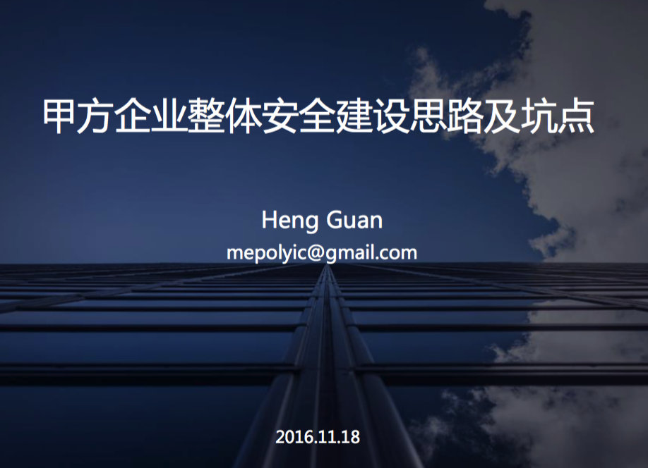建设支付宝的新安全体系 作者 郑歆炜 标签 安全体系 安全建设 简介 新时代,企业安全面临的威胁也发生了许多变化,新的攻击方法也给企业安全带来诸多挑战。如何建设新的企业安全体系来防护各种攻击成为企业安全人员新的任务! 提示 本站仅做资料的整理和索引,转载引用请注明出处