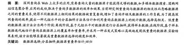 深网查询在w曲上众多的应用,需要查询大量的数据源才能获得足够的数据,如多媒体数据搜索、团购网 站信息聚合等.应用的成功,取决于查询多数据源的效率和效果.当前研究侧重查询与数据源的相关性而忽略数据源 之间的重叠关系,使得不同数据源上相同结果的数据被重复查询,增加了查询开销及数据源的工作负载.为了提高深 网查询的效率,提出一种元组水平的分层抽样方法来估计和利用查询在数据源上的统计数据,选择高相关、低重叠 的数据源.该方法分为两个阶段:离线阶段,基于元组水平对数据源进行分层抽样,获得样本数据;在线阶段,基于样本 数据迭代地估计查询在数据源上的覆盖率和重叠率,并采用一种启发式策略以高效地发现低重叠的数据源.实验结 果表明,该方法能够显著提高重叠数据源选择的精度和效率.