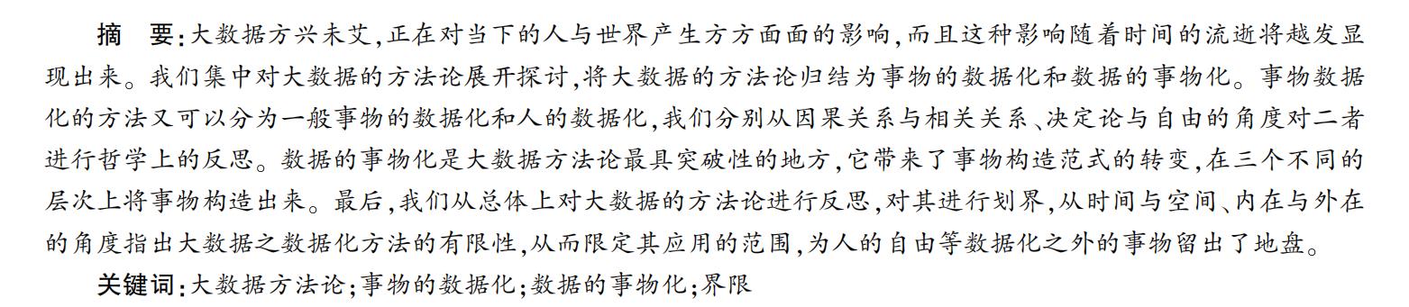 大数据方兴未艾,正在对当下的人与世界产生方方面面的影响,而且这种影响随着时间的流逝将越发显 化的方法又可以分为一般事物的数据化和人的数据化,我们分别从因果关系与相关关系、决定论与自由的角度对二者 进行哲学上的反思。 数据的事物化是大数据方法论最具突破性的地方,它带来了事物构造范式的转变,在三个不同的 层次上将事物构造出来。 最后,我们从总体上对大数据的方法论进行反思,对其进行划界,从时间与空间、内在与外在 的角度指出大数据之数据化方法的有限性,从而限定其应用的范围,为人的自由等数据化之外的事物留出了地盘。