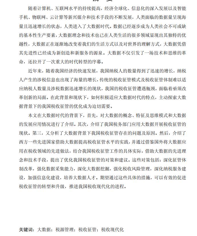 现状。第三,又分析了大数据背景下我国税收征管存在的问题及原因。然后,介绍了
