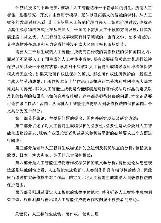 第五部分则通过否定人工智能的法律主体地位,并分析各人工智能生成物利