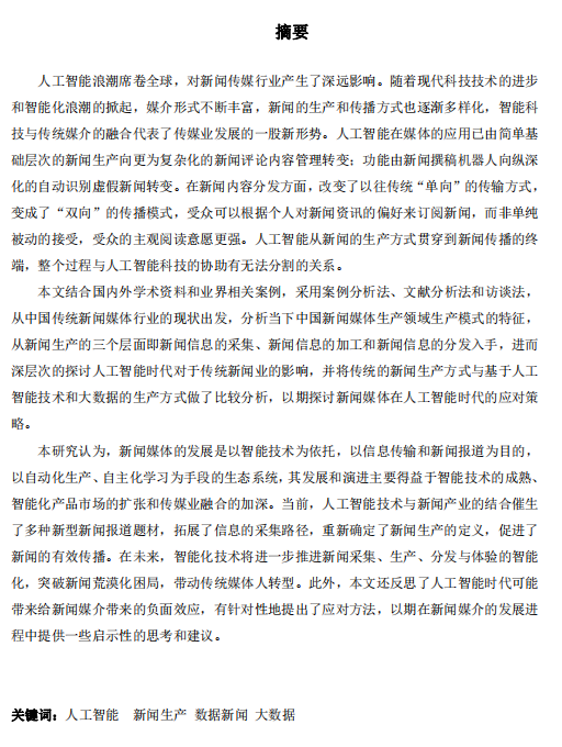 人工智能浪潮席卷全球,对新闻传媒行业产生了深远影响。随着现代科技技术的进步 和智能化浪潮的掀起,媒介形式不断丰富,新闻的生产和传播方式也逐渐多样化,智能科 技与传统媒介的融合代表了传媒业发展的一股新形势。人工智能在媒体的应用已由简单基 础层次的新闻生产向更为复杂化的新闻评论内容管理转变;功能由新闻撰稿机器人向纵深 化的自动识别虚假新闻转变。在新闻内容分发方面,改变了以往传统“单向”的传输方式, 变成了“双向”的传播模式,受众可以根据个人对新闻资讯的偏好来订阅新闻,而非单纯 被动的接受,受众的主观阅读意愿更强。人工智能从新闻的生产方式贯穿到新闻传播的终 端,整个过程与人工智能科技的协助有无法分割的关系