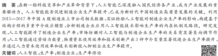 在新一轮科技变革和产业革命背景下 ,人工智能已深度融入国民经济各产业 ,成为产业发展的重 要驱动力 。 人工智能能否促进制造企业生产率提升 ,已成为新时代中国制造业高质量发展的关键 。 利用 2015 — 2017 年中国 A 股制造业上市公司相关数据 ,实证检验人工智能对制造企业生产率的影响 ,构建基于 结构方程的多重中介效应模型 ,分析制造企业应用人工智能技术影响生产率的内在机制及路径 。 研究发 现 ,人工智能提升了制造企业生产率 ;市场份额对人工智能与制造企业生产率的关系有显著负向调节作 用 ;人工智能通过劳动力数量 、物质资本使用效率和技术创新产出 3 种中介变量显著促进企业生产率提升 , 并通过人力资本使用效率和技术创新投入抑制企业生产率提升 。